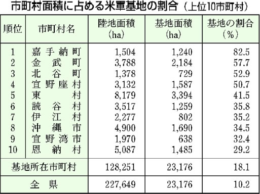 町の八割を基地が占める嘉手納町のほか、金武町、北谷町、宜野座村はいずれも基地面積が五割を超えます(表)。沖縄本島の二割近くが米軍基地に占領されているのです。