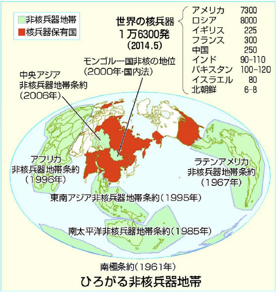 「非核兵器地帯」は、核兵器を持つことも外国が配備することも禁止した地域ですが、地図のように南半球を覆い、さらに中央アジアなどにも広がっていま す。戦火の絶えない中東でも、イスラエルを除く二二カ国すべてが、中東の非核兵器・非大量破壊兵器地域化に賛成しています。