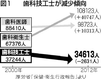 歯科技工士養成施設への入学者数は一〇年前の五四・五%に激減。それに加え、卒業後五年以内の離職が七五%、二〇~三〇代の離職率は約八〇%、担い手不足が懸念される事態です(図1)。