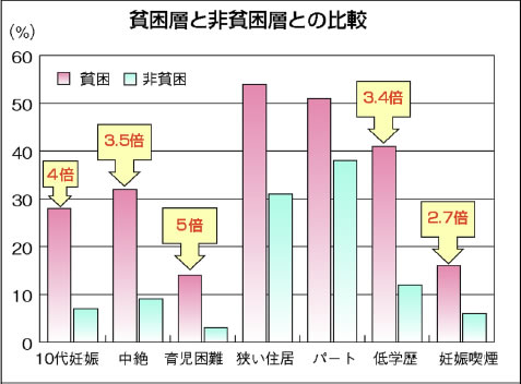 (1)一〇代の出産割合が非貧困層の四倍(2)中絶を約三分の一が経験し、非貧困層の三倍以上(3)生活保護および国民健康保険の割合が高い(4)一カ 月健診時に「育児困難」と評価された世帯が非貧困層の約五倍(5)一DK以下の住まいが過半数(6)母子家庭が非貧困層の五倍超で、母方多世帯母子家族の 割合が高い(7)妊娠前就労割合は非貧困層とほぼ同じだが、非正規雇用が過半数(8)母親の学歴は中卒または高校中退が四割、大学卒は非貧困層の四分の一 (9)母親の喫煙歴が過半数、妊娠中の喫煙率も高い。