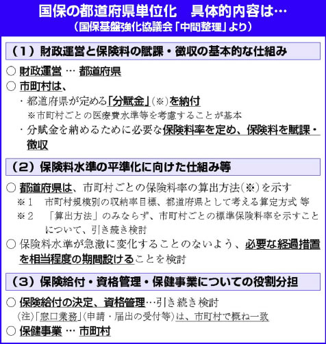 厚生労働省は昨年八月、「国民健康保険制度の基盤強化に関する国と地方の協議」(国保基盤強化協議会)で「中間整理」をまとめました。早ければ、今月末 から開かれる通常国会に、都道府県単位化などを盛り込んだ法案を提出する見込みです。