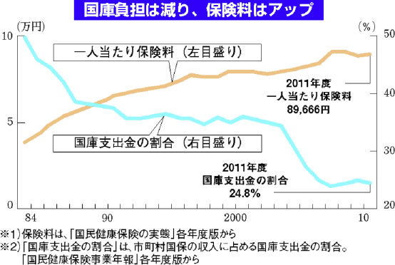 大きな原因の一つは国保財政に対する国庫負担を減らし続けていることです。一九八四年以降、国保に対する国の責任を後退させ、市町村国保の総収入に占め る国庫支出金の割合は八四年度の五〇%から二〇一〇年度の二五%に半減しました。その結果、一人当たりの国保料(税)は三・九万円から八・九万円へと二倍 以上に(図)。