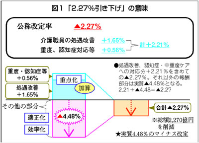 しかし今回の改定は、「マイナス二・二七%」とは言うものの、実際には「中重度・認知症ケア」(〇・五六%)、「処遇改善」(一・六五%)の加算を含めたもので、その他の部分は四・四八%のマイナス改定。土台となる基本報酬部分が軒並み引き下げられる内容となりました。総額二二七〇億円の削減です(図1)。