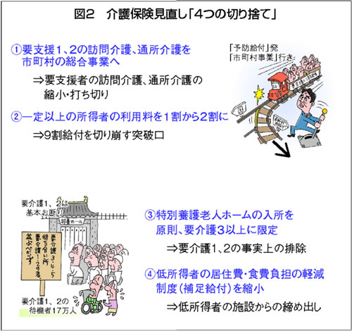 四月からは、利用者へのサービス内容も大きく変わります。安倍政権がめざす「自助」「互助」中心の社会保障解体戦略を具体化した「四つの切り捨て」です(図2)。