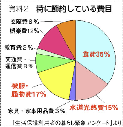 二度の引き下げ後、受給者の暮らしについて聞いた調査があります。法律の専門家や福祉関係者などでつくる生活保護問題対策全国会議が、昨年一一月に発表した「生活保護利用者の暮らし緊急アンケート」(回答一二八五人)です。生活が「思っていたより苦しくなった」という回答が六〇%にも。特に節約している費目は「食費」が最多の三五%、「被服・履物費」(一七%)、「水光熱費」(一五%)と続きます(資料2)。