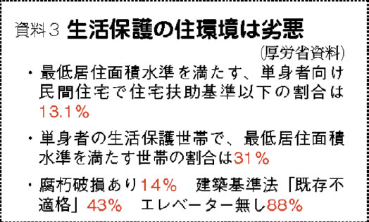 しかも、現行の住宅扶助ですら深刻な問題が。東京都で単身者では五万三七〇〇円(一級地)、二~六人世帯では六万九八〇〇円(同前)という基準額。「最低居住面積」を満たす住居が確保できず、建築基準法に違反した危険な住居に住む世帯は四割超など住環境は劣悪です(資料3)。