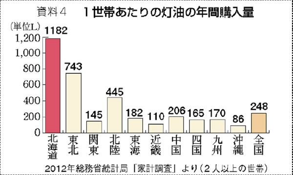 総務省の家計調査(資料4)では北海道の一世帯あたりの灯油の年間購入量は全国平均の四・八倍で、厚労省のいう加算額と実態とのズレはありません。電気料金値上げなどで、冬季加算では不足している現状も報告されており、病気や障害を持つ人の多い生活保護世帯にとって命に直結する問題です。