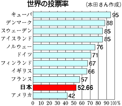 世界を見ると、キューバやデンマークなど、社会保障が充実している国ほど投票率が高い(図)。国民の政治意識と社会保障は正比例の関係です。三月に民医連の皆さんとキューバを視察しました。米国の経済封鎖で貧しい国ですが、医療と教育は無料。生活に不安がないから、国民は明るい。「人のために働きたい」と語るキューバの医学生に魅了されました。