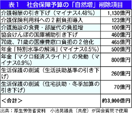 社会保障予算の「自然増」削減は、小泉政権の時代に毎年二二〇〇億円の規模で行われ、「医療崩壊」や「介護難民」が社会問題になるほどの打撃を与えました。ところが、今回の削減額は、計三九〇〇億円にのぼっています(表1)。「社会保障のため」といって消費税を増税した直後に、社会保障を大削減する予算を組んだのです。