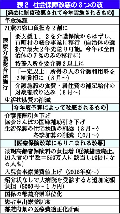 今年は、安倍政権の社会保障改悪が波状的に現場に押し寄せる年です。それには三つの流れがありますので、整理して押さえておきましょう(表2)。