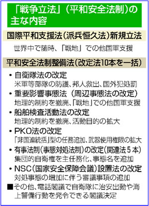 「戦争立法」関連法案は、新設する「国際平和支援法」と、これまで存在していた一〇の海外派兵法や有事法制をまとめて改定する一括法「平和安全法制整備法」の二本で構成されます(図)。