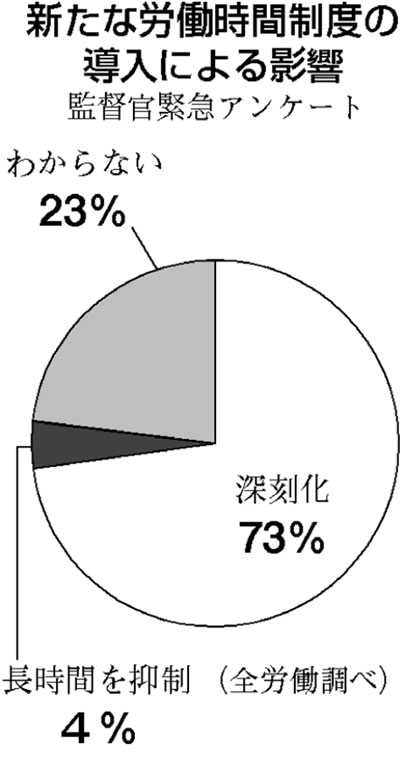 制度の影響は―。こんな調査があります。「労働基準監督官の多くが、残業代ゼロ制度に反対」。労働基準監督官は、働く人の安全や労働環境改善のために働く専門官。労働基準監督署やハローワーク職員などの労働組合(全労働)が二〇〇〇人の監督官に行った緊急アンケートです。制度に反対が五四%、賛成はわずか一三・三%でした。