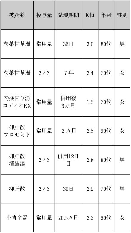 今回、過去5年間に報告された、漢方製剤による重篤度2(重篤な副作用ではないが、軽微な副作用でもないもの)以上の21症例を分析した結果、低カリウム血症が7例もありました。偽アルドステロン症を疑う血圧上昇と浮腫の1例と、低カリウム血症を疑う歩行困難の1例を加えると、甘草に含まれるグリチルリチンによると思われる症例が9例となります。他は、発疹などの過敏症が7例、間質性肺炎が3例、肝障害が2例でした。