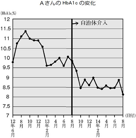 その結果、AさんのHbA1cは八・五%まで下がりました。Aさんの表情も明るくなり、自分が多くの人に見守られているという実感が持てたことで治療に前向きになり、毎日の運動も続けられている様子です。