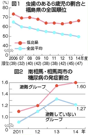 南相馬・相馬の両市では、原発事故前と比較し、糖尿病と高脂血症の発症が高くなっています。日英の研究者が、08~14年に特定健診を受診した両市の6406人のデータを分析しました。