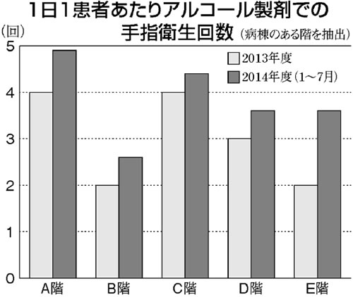 二〇一二年度に手指衛生の対策を大きく変更しました。それまでの介入を、菊池さんが認定看護師の資格を取得してから見てみると、効果が低いと感じたためです。病院全体に手指衛生を定義させるねらいで、WHOの『医療機関における手指衛生ガイドライン』と『手指衛生改善のための手引き』をもとに対策をすすめました。