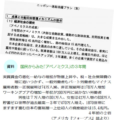 各分野のチェックに入る前に、「プラン」冒頭の記述を紹介しておきます。一行目で「三年間のアベノミクスは大きな成果を生み出した」とし(写真)、続けて連ねたデータは、国民総所得や税収の増加や日本企業の収益が史上最高に達したこと、就業者数が一〇〇万人増加など、明るいものばかり。