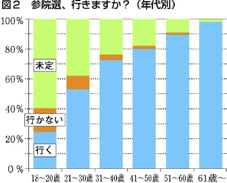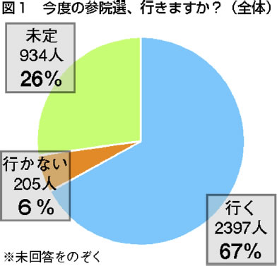 投票に行くか行かないか、の問いには、「行く」の回答が六七%、「行かない」は六%、「未定」が二六%。三分の一近くが、決めかねていることが分かりました。世代別に見ると、「未定」や「行かない」が若い人ほど多く、一八~二〇歳では「行く」が二〇%台(図1、2)。