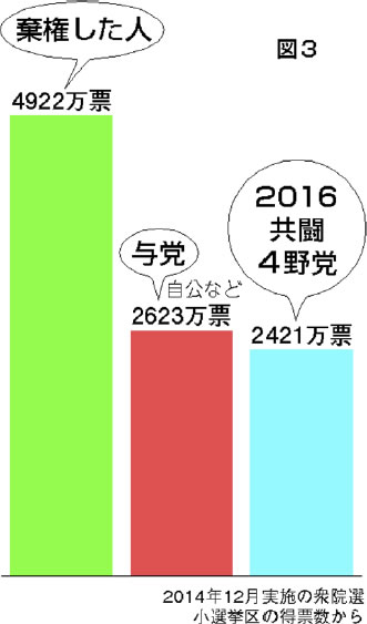 図3を見てください。一四年の衆院選では、棄権した人の数が与党の得票も野党の得票も大きく上回っています。この層が、政治を変えるカギを握っています。