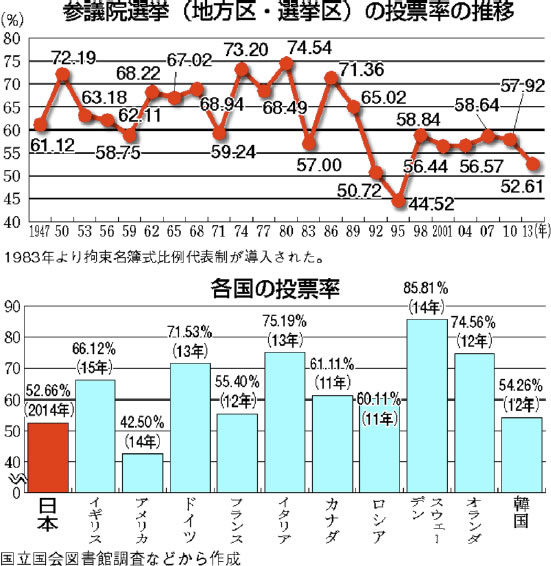直近の国政選挙・二〇一四年の衆院選挙の投票率は五二・六六%。自民党は、小選挙区では全有権者の約二五%の得票で、議席の七五%を獲得しました。「棄権」は、「投票した他人の選択にお任せ」ということになります。国民の思いと国会ですすむことがかけ離れてしまう一因になっています。