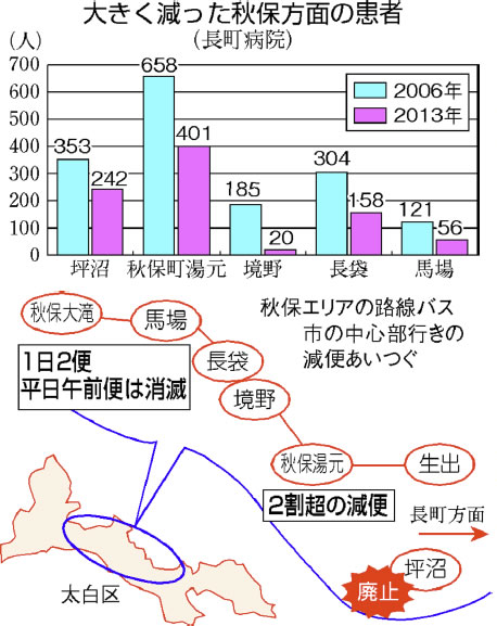 長町病院の長年の患者・庄子みや子さん(85)も影響を受けた一人です。秋保温泉郷からさらに山あいに入った長袋地区でひとり暮らしです。自宅から病院まで車で直行すれば一時間もかかりません、市の中心部に行く路線バスが午前・午後各一本に減り、午前の診療に間に合う便がゼロに。バスを乗り継ぎ九時半の診察に行くには三時間かかるようになりました。