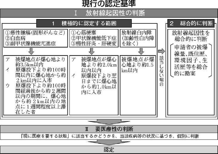 しかし、厚労省は「確認書」を守らず、認定基準を狭く適用し、残留放射線の影響をほぼ否定するという状況がその後も続きました。がんでは「三・五km以内被爆」「入市は一〇〇時間以内」と線引きし、がん以外の疾患では、爆心地からの距離が一・五kmを超える人や入市被爆者を認定しませんでした。例えば、心筋梗塞では一km、肝機能障害では〇・七kmの被爆距離でも却下されています。