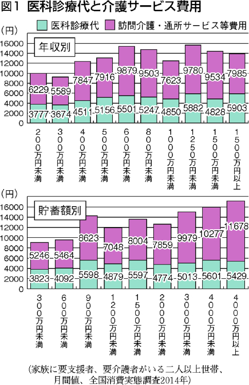 受診や介護サービスの利用抑制と貧困の関係が現れたデータも。図1は、介護サービスの利用と世帯収入の関係を示しています。その傾向は世帯の貯蓄額で見るとさらに顕著で、貯蓄の少ない世帯はサービス利用も抑制しています。