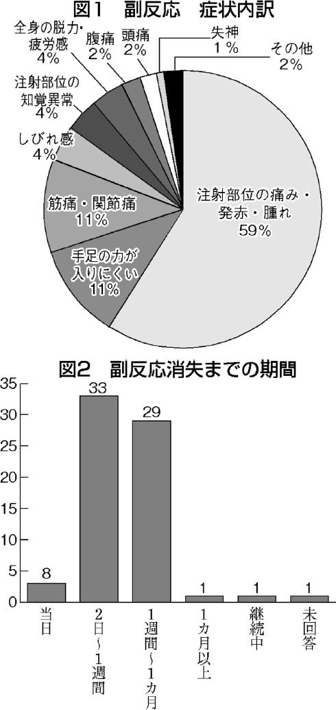 全接種者の回答率は三七%でした。副反応は、回答者の接種回数総計の六七七回のうち、四四件(一七%)で発生していました。ほとんどが軽微で「注射部位の発赤」が最多の五九%、「手足の力が入りにくい」「筋肉痛」がそれぞれ一一%と続きました(図1)。