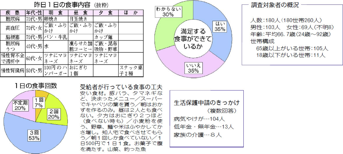 食事に関わる項目にも気がかりな点が多数(資料上)。三五%が「満足する食事ができていない」と回答しています。一日二食以下の人は三割近く。回数を抑えるだけでなく、野草を採ったりスーパーで野菜くずを貰うなど空腹を満たすために「工夫」している状態でした。調査前日の「食事内容」も、治療中の疾患に配慮する余裕もない献立が散見されました。
