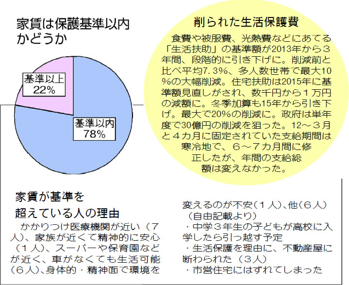 二〇一三年の生活扶助費削減を皮切りに、この間生活保護制度の改悪が連続しました(下)。今回の調査は「家賃扶助」と、冬の暖房費に対する「冬季加算」が削減されて初めてのものでした。