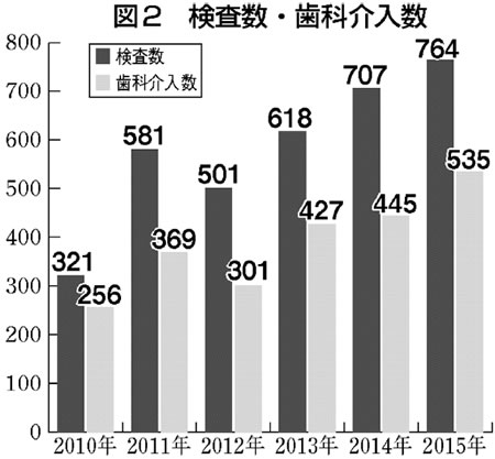 二〇一五年は検査数七六四件、歯科介入数五三五件と、二〇一〇年の開始時から倍増しました(図2)。入院患者の熱発や肺炎発症率も減少し、病棟内に漂っていた口臭も改善しました。