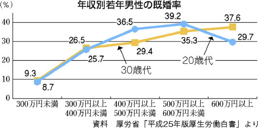 一般的に、ワーキングプアは「年収二〇〇万円以下」とされますが、根拠はよく分かりませんし、これでは将来の課題は見えません。私は、“結婚の壁”に直面する年収三〇〇万円未満を貧困ラインにしました。「平成二五年版厚生労働白書」では、年収別若年男性の既婚率は、年収三〇〇万円未満では二〇歳代八・七%、三〇歳代は九・三%と一割にも届きません。年収三〇〇~四〇〇万円では、二〇歳代二五・七%、三〇歳代で二六・五%。年収三〇〇万円未満層は経済的理由で結婚したくてもできない、今日の貧困です(下図)。