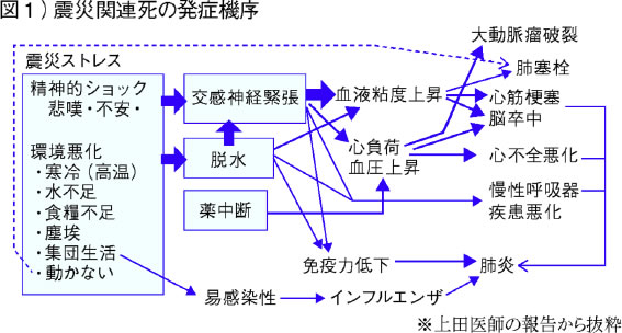 災害関連死は、災害による精神的ショックや生活環境の悪化がきっかけで起こります(図1)。高齢者や要介護者、障害者など、非常時に耐える力が弱い人に起きやすく、もともと健康な人にはほぼ起きません。しかし、長時間同じ姿勢でいると発症する肺塞栓症(エコノミークラス症候群)は中年層、ことに女性に多発するので注意が必要です。