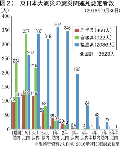 東日本大震災の関連死者数は岩手、宮城、福島の被災三県で約三五〇〇人。そのうち二〇〇〇人以上が福島県で、震災後五年というケースも二桁にのぼります(図2)。「原発事故やそれに伴う避難生活があまりに理不尽で、遺族が納得できないから」と上田医師。