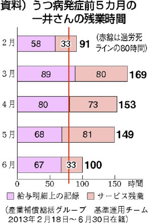一井:一三年二月に法人賠償総括の「基準運用チーム」に配置されました。賠償の審査担当者やその管理者、一一のグループ六〇〇人が判断に迷う案件の相談に乗り、賠償方針を指南する役目です。審査経験や基準関係が経験不足なのにアドバイスしなければなりませんでした。最初は質問の意味も分からず、休日をフルに使って勉強するしかありませんでした。サービス残業を入れると残業は最大で一六九時間でした(下資料)。指南した内容が同業他社の賠償にも影響するため、ミスが許されません。