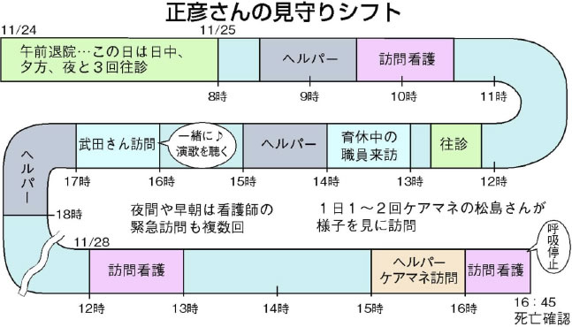 退院から四日後、正彦さんは息を引き取りました。火爪医師が死亡確認に行くと、複数の職員が集まり、枕元で泣いていました。「いい旅立ちだと思いました。夜中に不安になると病院に眠りに来るほど病院が好きだった正彦さんが、最後は『家に帰りたい』と言い続けた。センターや地域の人に見守られて逝きたかったのかな」。