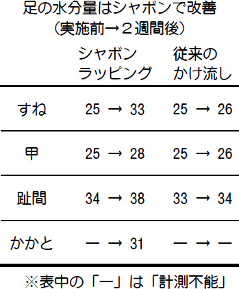 患者さんに実際の効果を試してみました。片足はシャボンラッピング、もう一方は従来のかけ流す方法で毎日行い、二週間、足の水分量を計測しました(表)。