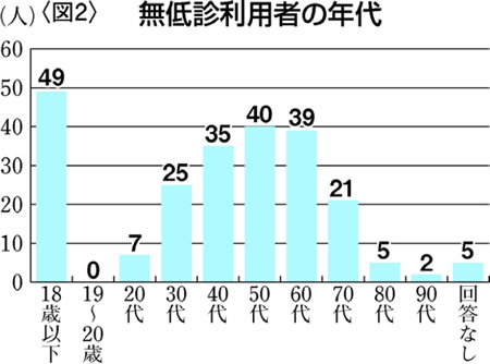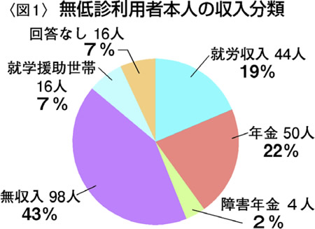 二〇一五年四月~一六年三月、四県連の事業所で全ての新規利用申請者二二八事例を調査、分析しました。男女比は六対四で四〇~六〇歳代が半数。一八歳以下が四九人と多いのは、北海道で教育委員会を通じて無低診を周知しており、就学援助世帯を無低診の対象としているためです。