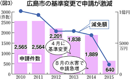 以前の広島市の基準は、「生活保護基準一三〇%以下」。その結果、二〇一〇年度に広島市で生活に困窮した市民が利用した制度のうち、生活保護と並んで国保四四条が全体の三割を占めました。しかし広島市は一二年に基準を変更し、「一年以内の収入ダウン」を条件にしました。毎年二〇〇〇件前後あった四四条利用は一五年には六四〇件まで激減。これまで利用していた人も対象外となり、未受診になった事例もあります。