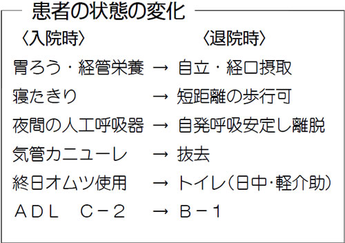 入院して三カ月で車いす移乗が可能になり、六カ月で起立訓練ができるまで向上。また、気管カニューレも抜去でき、人工呼吸器から完全に離脱できました。
