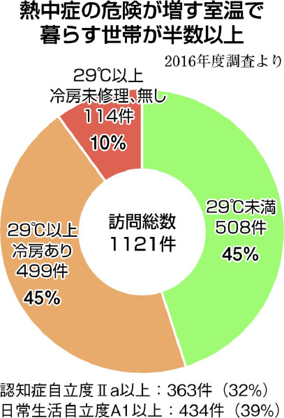 二〇一六年度に集めたデータは一一二一件。室温三〇度以上は四八〇件で四割を超え、二九度以上では六一三件と五割超え(図)。また経済的理由でエアコンを設置していない、あるいは二時間未満とほとんど動かしていない人を調べると、九・二%(一〇四件)に上りました。認知症自立度IIa以上が三割と、熱中症予防のためにエアコン使用を呼びかけても理解が困難な人が多いことも判明。日常生活自立度で、準寝たきり(A1)以上が約四割に上るため、行政が呼びかけるような冷房のきいた街中のシェルターへの避難には、特別な手立てが必要で、有効ではありません。こうした傾向は続いています。