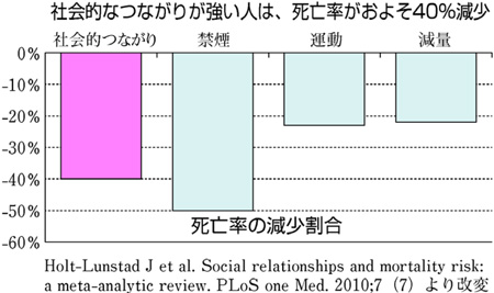 「日本には、患者会活動と健康の関係の検証がほとんどありません。社会的なつながりが強いことが、運動や減量より長生きに効果がある、という研究がありますが(下図)、患者会活動は社会的支援のひとつになっているのか、ヘルスリテラシーの強化につながっているか、集団で闘病することが血糖コントロールに影響しているか―。こうした点が検討課題です」。