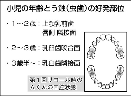 一~二歳に虫歯がよくできる上顎前歯部はきれいで、臼歯が生えた二歳後半から咬合面に虫歯ができたことから、二歳後半に虫歯の原因となる生活の変化があったと考えた。また、臼歯隣接面の虫歯好発時期は三歳半だが、それより早く短期間に虫歯ができており、原因の発見と改善が急がれた。