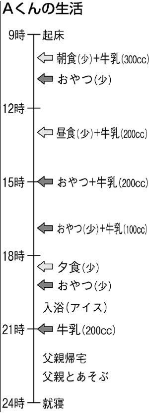 一日の生活を聞き取ると、おやつは少量だが回数が多く、牛乳を一日一リットル飲んでいること、就寝時間が二四時と、遅いことが判明(図)。母親の考えを探るため、Aくんの生活面について質問すると、意外な答えが返ってきた。