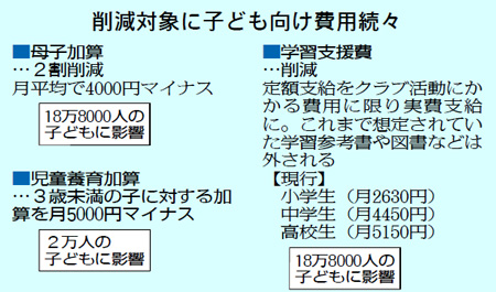 子どものいる世帯への加算や支援費も削減対象に(資料参照)。
