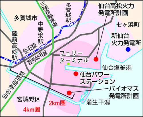 「なぜまた石炭を燃やすの?」建設の報道をみた宮城民医連の水戸部秀利医師(若林クリニック所長)は驚きました。自身もPSの四km圏に住んでいます。高度経済成長期に各地で公害が発生しましたが、宮城も大気汚染が強かった地域でした。現在ようやく環境基準値を超えない程度になったのに、再び汚染が始まります。しかも県内の電力は足りています。PSは関西電力と伊藤忠エネクスの子会社の共同出資の発電所、「電気は東京へ、お金は関西へ、汚染は仙台へ」という構図。さらに四国電力と住友商事の資本の火力発電所(仙台高松発電所・仮称)の計画まで(地図)。