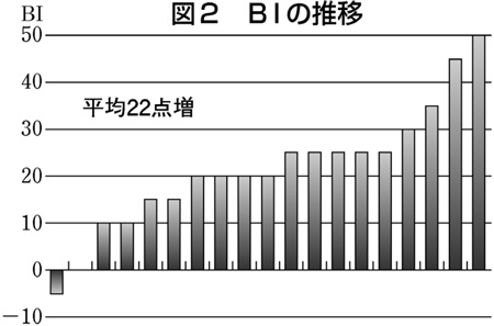 日常生活の能力を評価するBI(Barthel index)は、一七人が向上。維持、減少はそれぞれ一人でした(図2)。