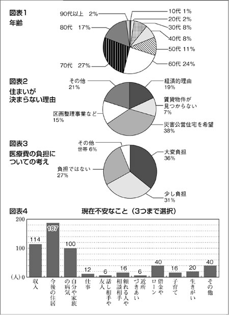 仮設での生活で、震災前より体調が悪化した人は五一%(一八三人)で、「部屋が狭くて押し入れで寝ている」(六〇代男性)「親は震災前元気だったが、震災後、心労から通院が増えた」(四〇代女性)などの声が聞かれました。