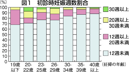 二〇一五年一年間に受診した八二九例の妊婦をみると、通常より遅い一二週(妊娠四カ月)以降の初診が若年妊婦では三割近くに上ります(図1)。シングルで出産した妊婦の背景を見ると若年者が多く、初診週数は三〇週(妊娠八カ月)を過ぎている場合もあり、転院を繰り返すなど診療が継続しにくい傾向がありました。