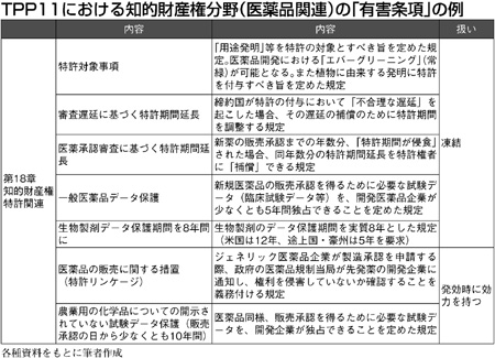 凍結項目の約半数は知的財産権にかかわる「有害条項」です。例えばバイオ医薬品のデータ保護期間や特許対象事項(「用途発明」を特許の対象にでき、医薬品特許のいわゆる「エバーグリーニング」を可能とする)、さらに新規医薬品の販売承認を得るために必要な試験データ(臨床試験データなど)を開発医薬品企業が最低五年間独占できる規定などです。